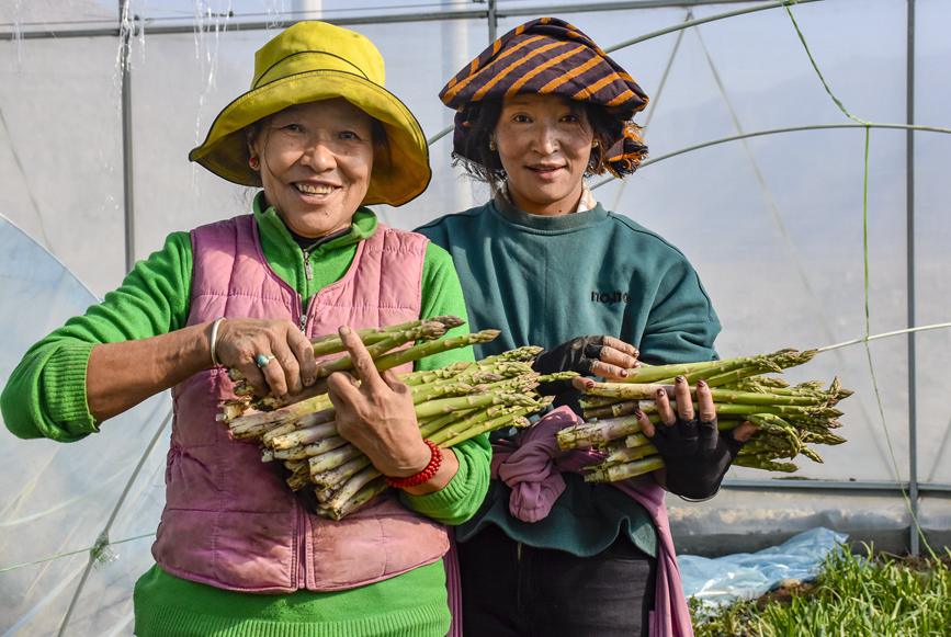 章達村村民次仁卓瑪展示高原有機蘆筍。劉楓攝