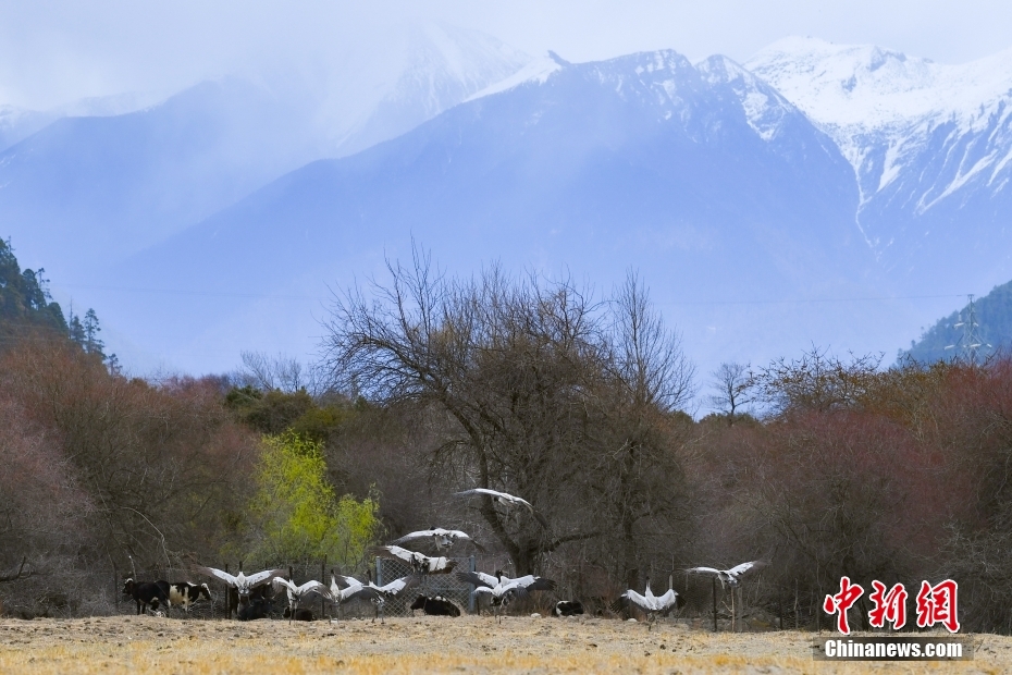 3月30日,在西藏林芝市巴宜區(qū)更章門巴民族鄉(xiāng),黑頸鶴與周邊的村莊、桃花、雪山融為一體,成為春日里的一道靚麗的風(fēng)景線。[詳細(xì)]