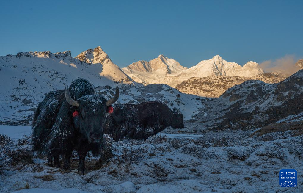 這是在嘎瑪溝中拍攝的牦牛和雪山(4月17日攝)。新華社記者 丁增尼達(dá) 攝