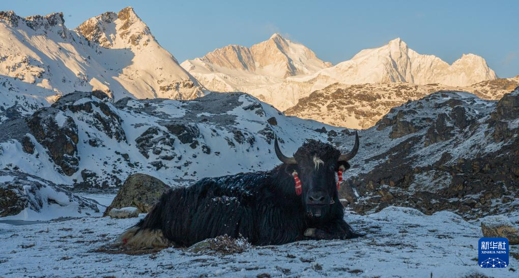 牦牛在嘎瑪溝中的雪山前休憩(4月17日攝)。新華社記者 丁增尼達(dá) 攝