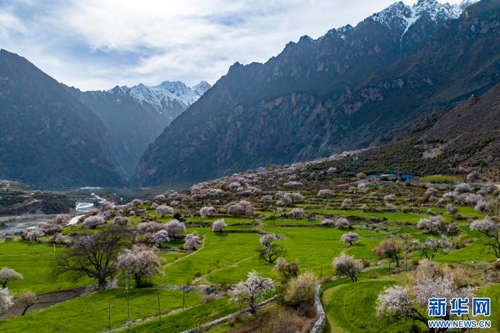 4月18日,在嘉黎縣尼屋鄉(xiāng)扎西崗村盛開的桃花(無(wú)人機(jī)照片)。新華網(wǎng) 旦增努布 攝