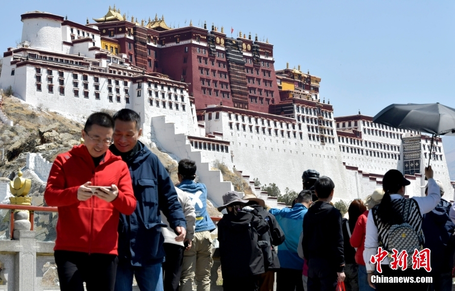 4月23日,游客在拉薩藥王山觀景臺(tái)拍照留念。隨著西藏旅游旺季臨近,中外游客來到雪域高原觀光旅游。中新社記者 李林 攝