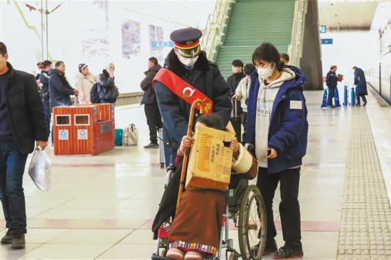圖為拉薩車站“天路格?;ā鼻嗄曛驹阜?wù)隊(duì)工作人員為旅客服務(wù)。 孫皓 記者 丹增群培 攝