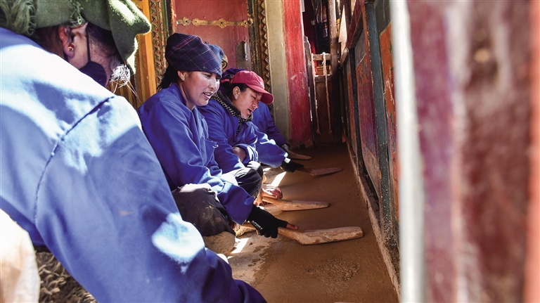 5名藏族女工一邊唱著歌,一邊用手中的工具“帛多”夯打著腳下的碎石和泥土,木棒夯土的聲音是節(jié)奏,歌聲與步調(diào)統(tǒng)一,她們一輪又一輪地合唱著。在不間斷地敲打地面數(shù)小時后,石子狀的“阿嘎”被打成平地。達桑告訴記者,這是泥匠組在通過“打阿嘎”對布宮地面有裂縫的地方進行修補。