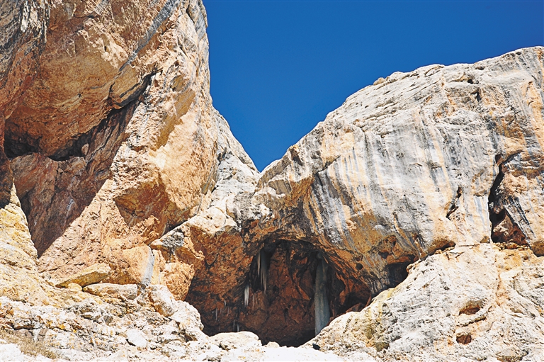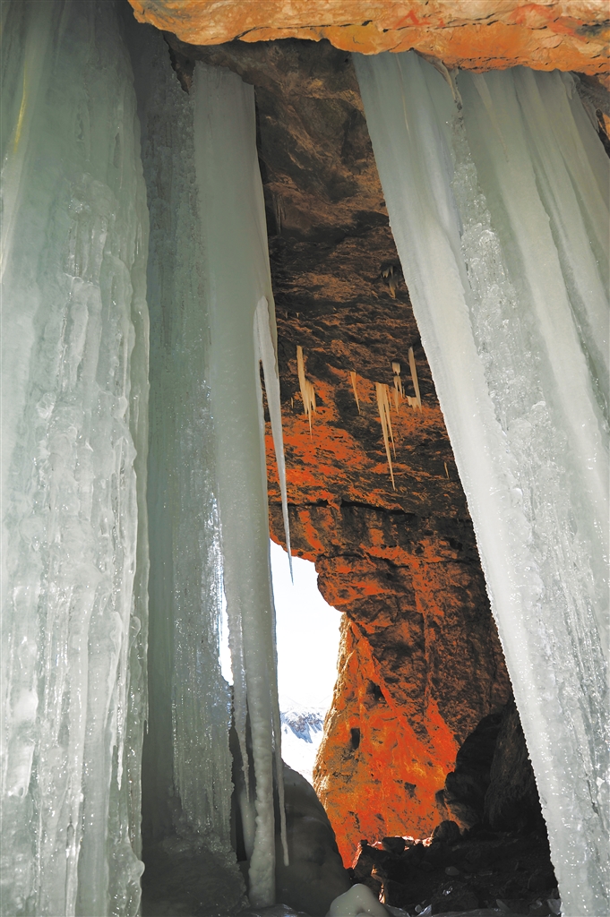 門(mén)莫溶洞在山頂,海拔4974米,有著世界上最高溶洞的美譽(yù)。望之可及,登則不易,最后幾百米碎石路尤險(xiǎn)。溶洞呈豎井式,洞底深幽,直達(dá)地心深處;洞口開(kāi)闊,一條條冰簾垂天際,透過(guò)山頂洞口遠(yuǎn)觀地球之巔,仿佛我們這些“山頂洞人”透過(guò)這門(mén)莫之眼,也可參天地悟古今,瞬間將剛才登山的肺腑翻騰忘卻于腦后。