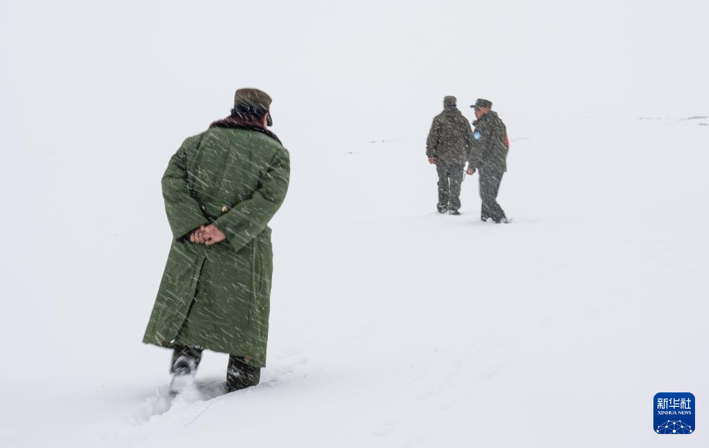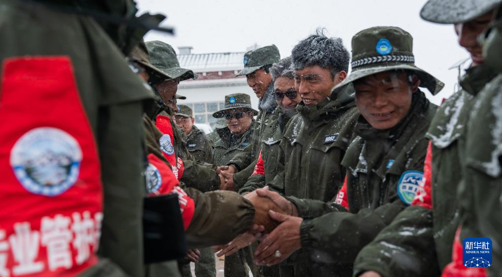 布查玉管護站的野生動物管護隊員們熱情歡迎風雪中前來巡護的同事(5月7日攝)。新華社記者 丁增尼達 攝 ??