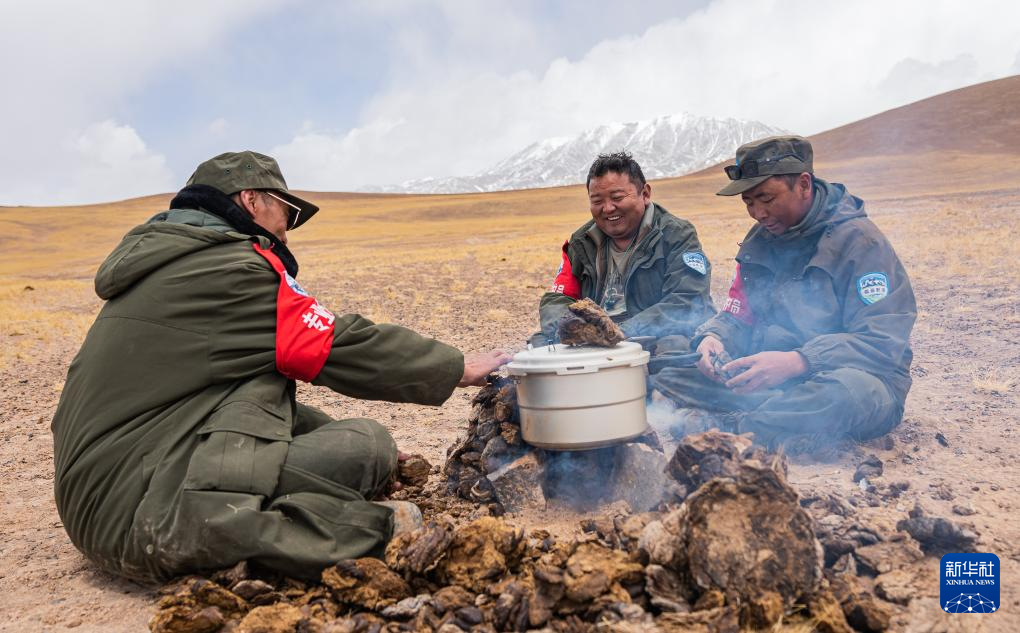 ??野生動物專業(yè)管護隊員在巡護途中就地取材,用野牦牛糞生火做飯(5月10日攝)。新華社記者 丁增尼達 攝