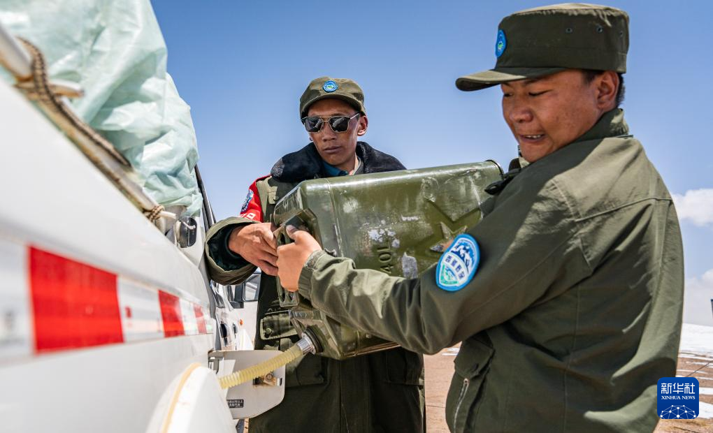 ??野生動物專業(yè)管護隊員在巡護途中給車輛加油(5月9日攝)。新華社記者 丁增尼達 攝