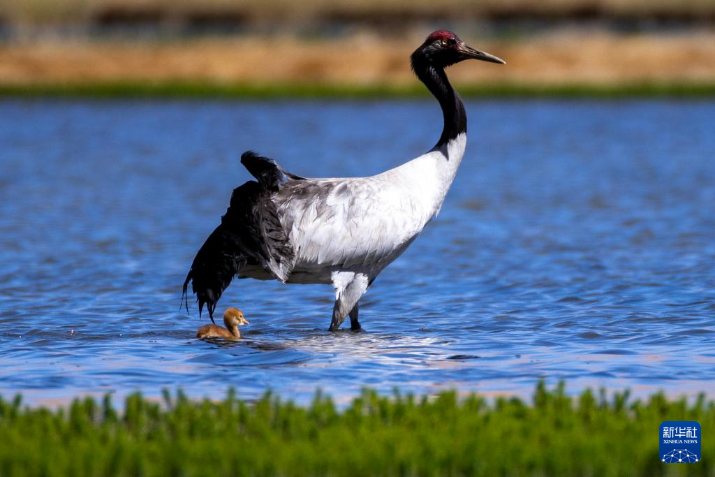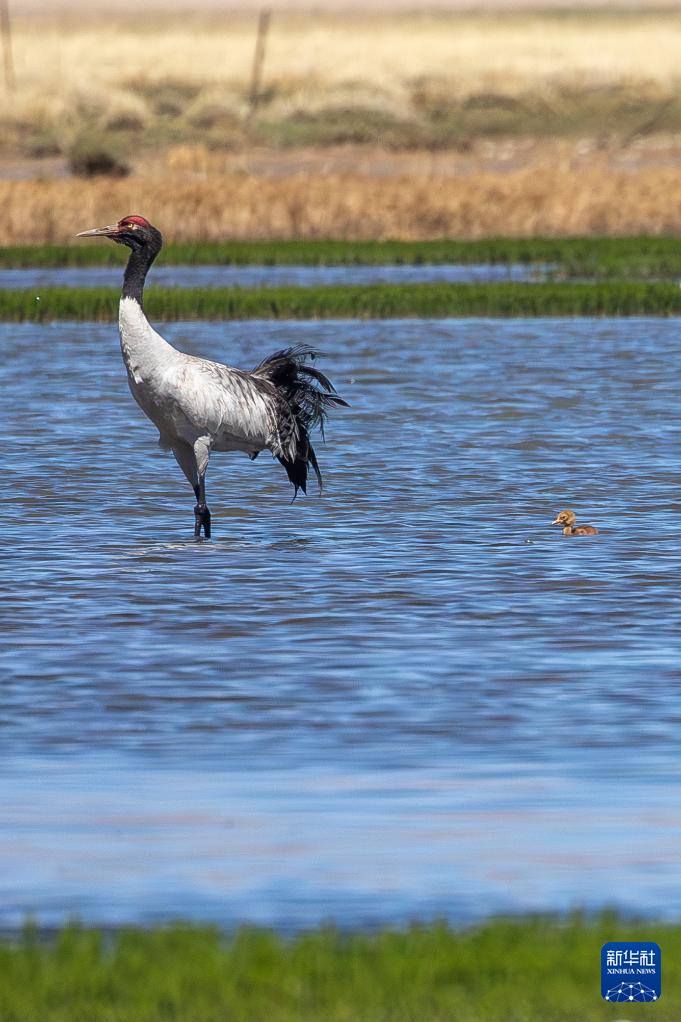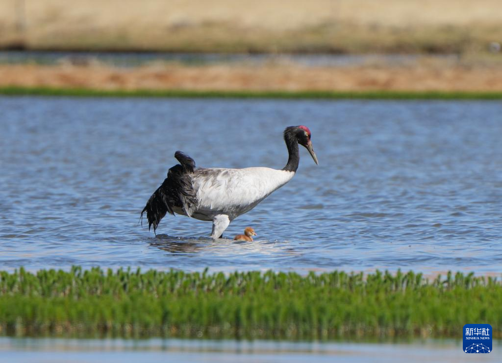 6月9日,黑頸鶴帶著雛鳥在西藏那曲市申扎縣一處濕地棲息、覓食。新華社記者 旦增尼瑪曲珠 攝