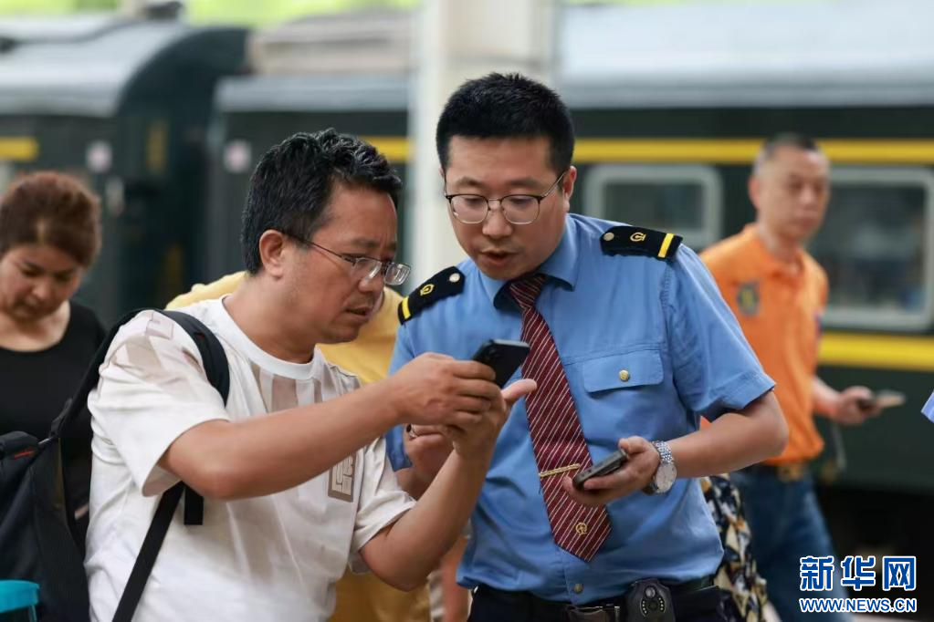鐵路工作人員正在幫助旅客查看核對乘車信息。(中國鐵路青藏集團公司供圖)