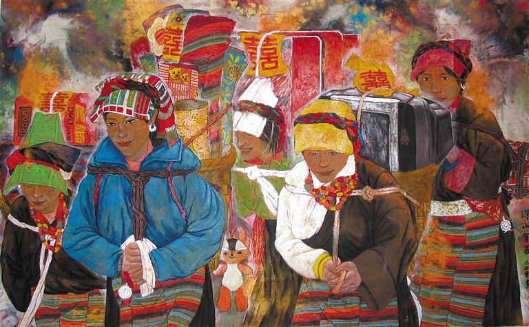 “藏族傳統(tǒng)文化不僅是中華民族文化的重要組成部分,也是世界文化的一角。將藏漢文化有機(jī)融為一體,是藝術(shù)家的歷史責(zé)任,也是藝術(shù)家取之不盡、用之不竭的永恒題材?!蔽鞑孛佬g(shù)家協(xié)會(huì)理事、二級(jí)美術(shù)師、西藏美術(shù)館展陳部主任周明暉說。