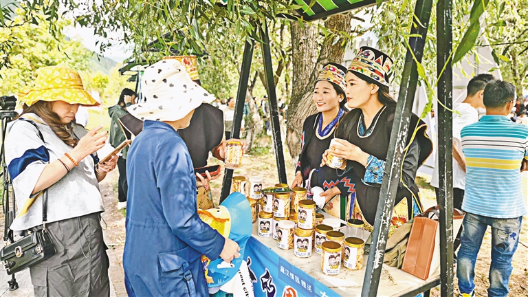 圖為林卡主題音樂會上,工作人員為市民、游客介紹農特產品。