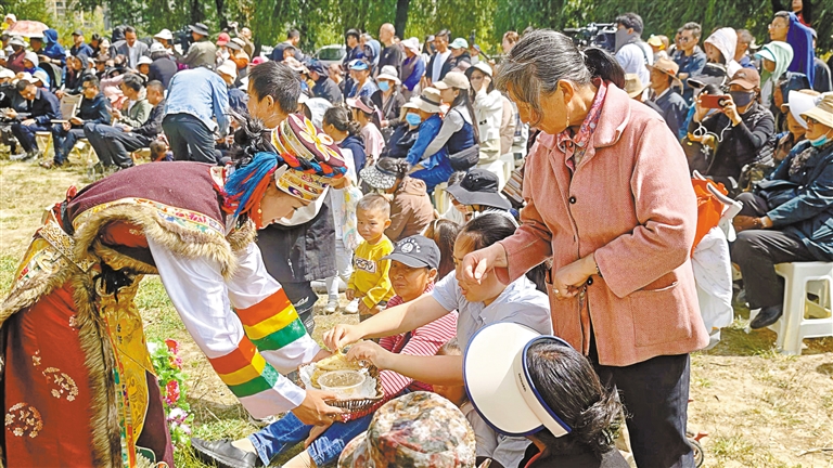 現(xiàn)場設置了工布藏族服飾比賽、傳統(tǒng)美食體驗及農特產品試吃、藏骰體驗等活動。一場別開生面的非遺與美食的碰撞,讓市民、游客盡享“文化大餐”。來自巴宜區(qū)四鎮(zhèn)三鄉(xiāng)的蕎麥餅、酸奶醬、藏香豬、藍莓、玫瑰茶等出現(xiàn)在傳統(tǒng)美食體驗及農特產品試吃活動中,吸引不少市民、游客駐足品嘗,近距離享受著非遺帶來的韻味與魅力。