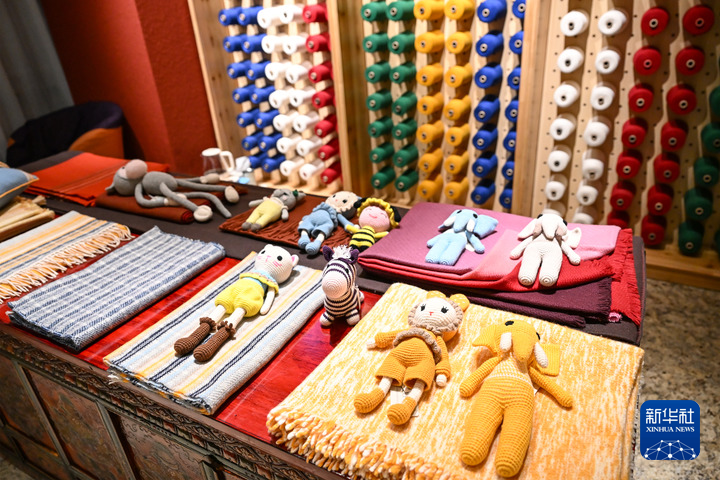 在西藏日喀則市一間門店拍攝的玩偶、圍巾、披肩等江孜氆氌產(chǎn)品。新華社記者孫瑞博 攝