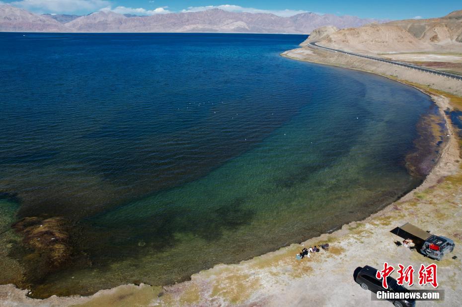 10月4日,游客在班公湖邊休閑露營?!笆弧眹鴳c假期,不少游客來到西藏日土縣班公湖游玩。(無人機照片)中新社記者 崔楠 攝
