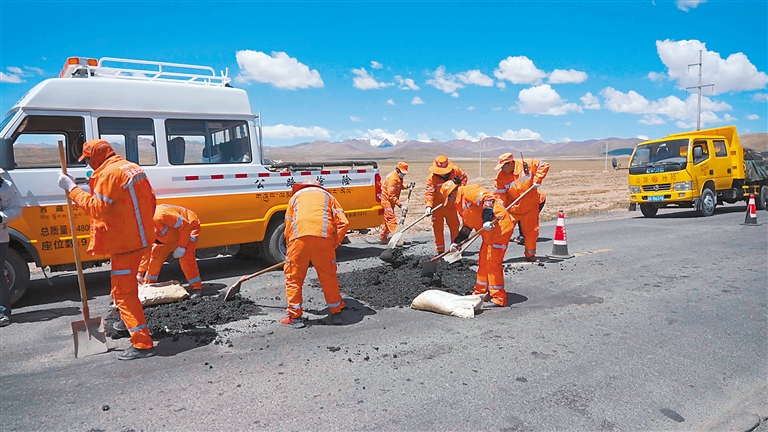 “我們養(yǎng)護(hù)的這段公路,每年只有兩個(gè)季節(jié),冬季和夏季。冬季漫長,主要的工作是鏟雪保通;夏季短暫,主要就是不斷填坑鋪油?!钡馗赂嬖V記者,青藏公路長期承擔(dān)著進(jìn)出藏物資運(yùn)輸重任,每天進(jìn)出藏車流量大。養(yǎng)護(hù)保通工作雖然單調(diào),但大家都明白這份工作的重要性。