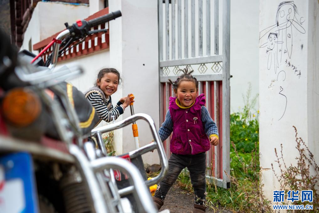 10月19日,在西藏昌都市卡若區(qū)境內(nèi)拍攝的小朋友(無人機照片)。新華網(wǎng) 旦增努布 攝