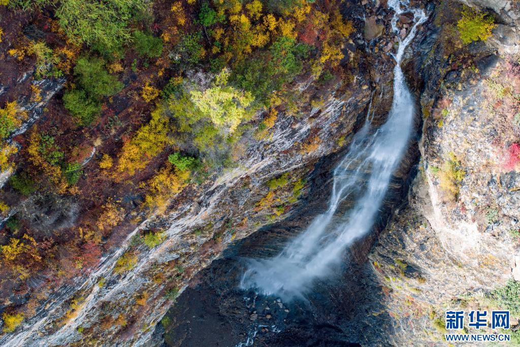 10月11日,在西藏林芝市波密縣境內(nèi)川藏公路沿途拍攝的瀑布(無人機照片)。新華網(wǎng) 旦增努布 攝