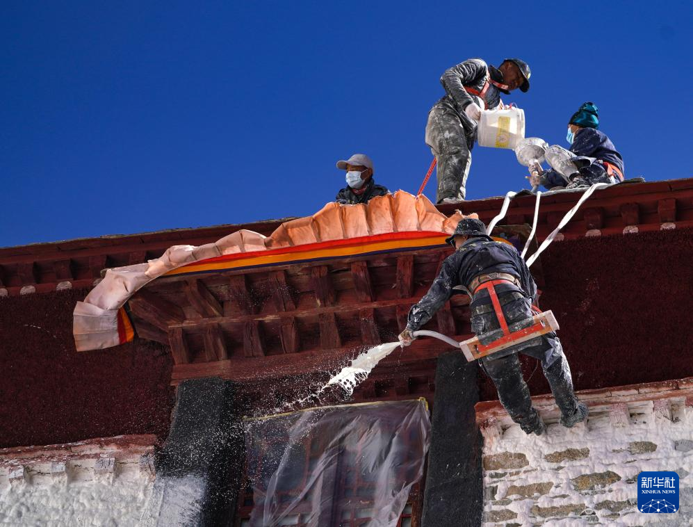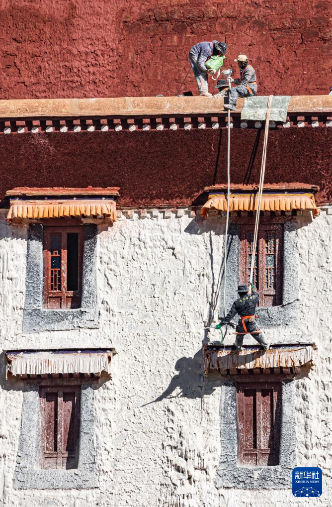 10月30日,布達(dá)拉宮管理處的工作人員在噴灑涂料。新華社記者 丁增尼達(dá) 攝  ??