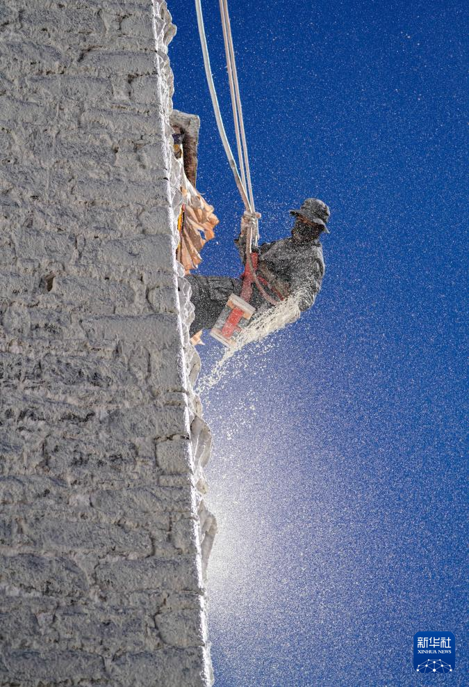 10月30日,布達(dá)拉宮管理處的工作人員在噴灑涂料。新華社記者 旦增尼瑪曲珠 攝  ??
