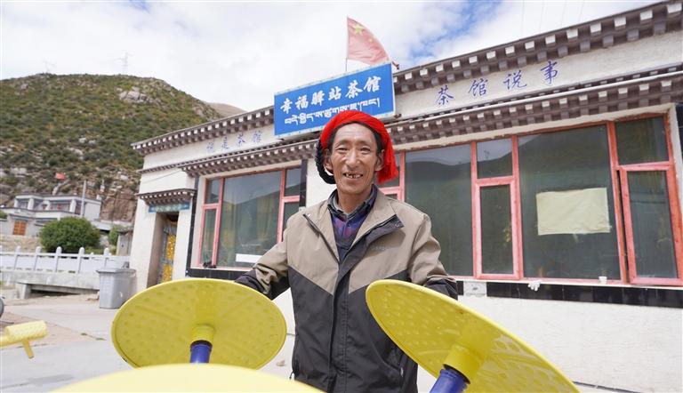 圖為怎村村民索朗塔杰在村幸福驛站茶館健身。 記者 劉斯宇 攝