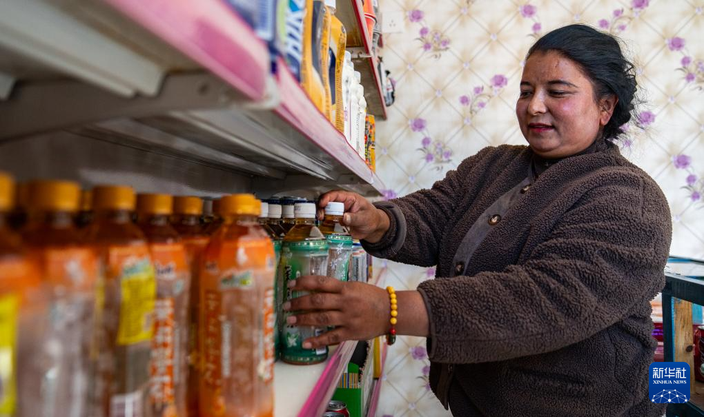 12月15日,一名達(dá)曼新村的婦女在自家商店里整理貨架。新華社記者 丁增尼達(dá) 攝  ??