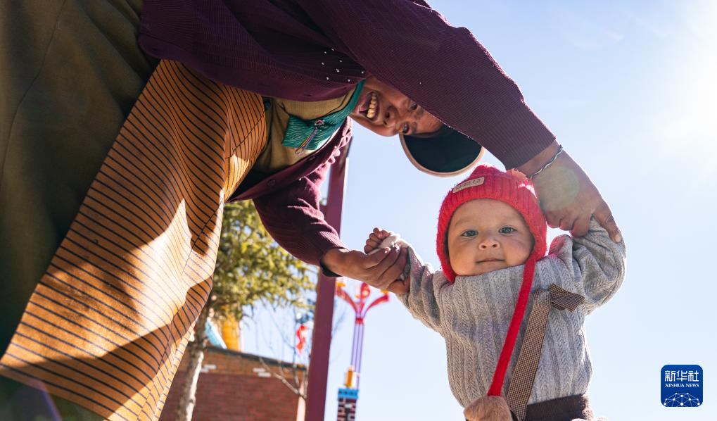 12月15日,達(dá)曼新村的一名婦女在教孩子走路。新華社記者 丁增尼達(dá) 攝  ??