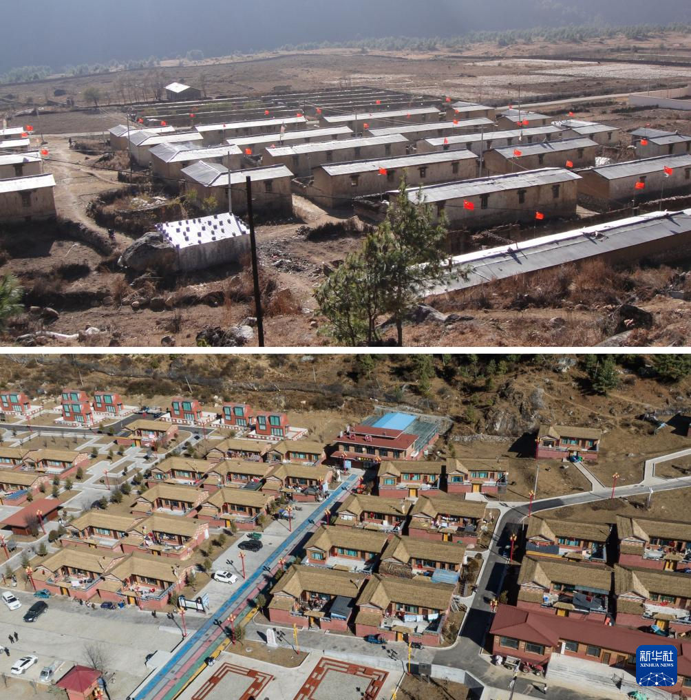 拼版照片,上圖為:2005年拍攝的達(dá)曼新村(新華社發(fā));下圖為:2024年12月15日拍攝的達(dá)曼新村(無人機(jī)照片,新華社記者丁增尼達(dá)攝)。新華社發(fā)  ??