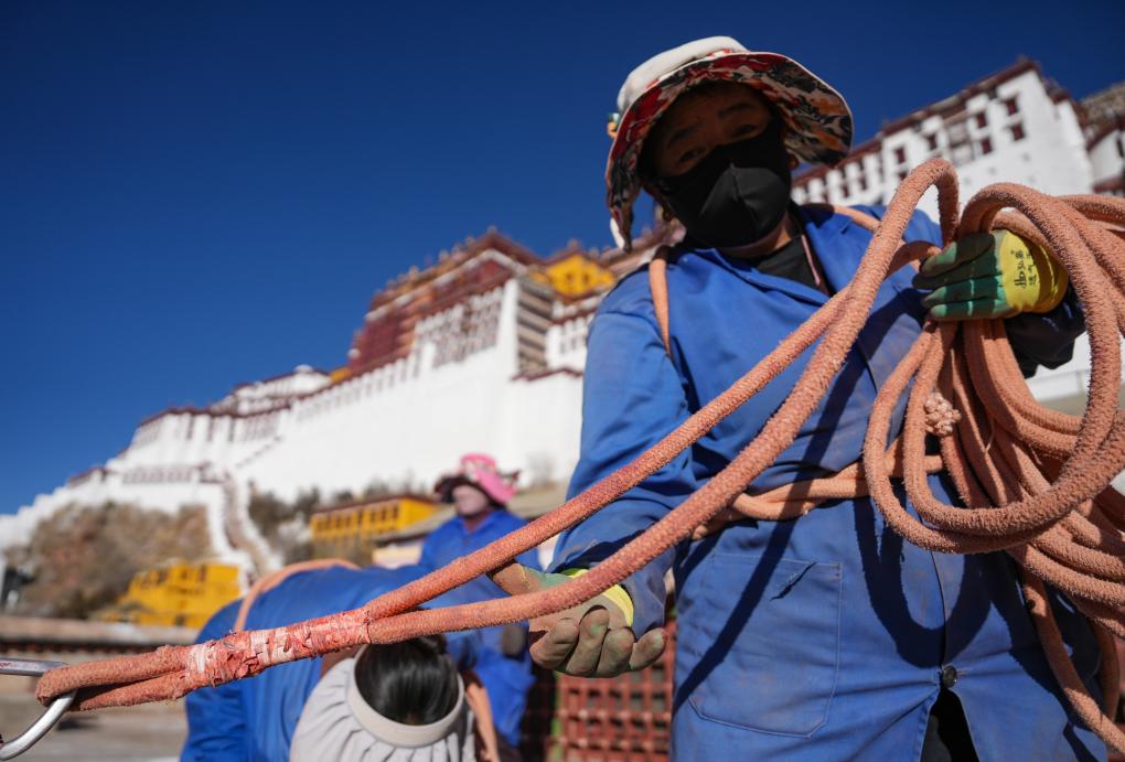 泥匠組正在整理粉刷墻體的安全繩。新華社記者 晉美多吉 攝