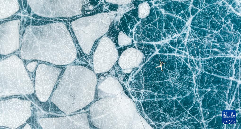一名游客躺在恰央錯結(jié)冰的湖面上拍照(1月26日攝,無人機照片)。新華社記者 丁增尼達 攝