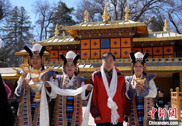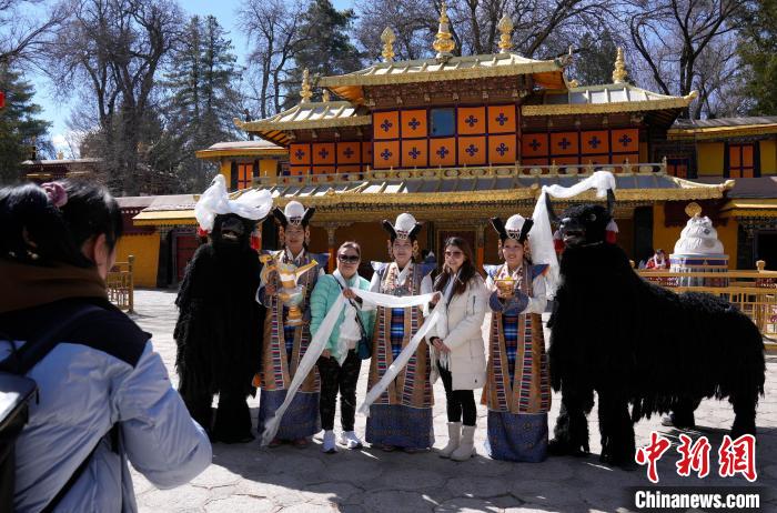 圖為歡迎儀式現場,香港游客在羅布林卡與身著拉薩傳統(tǒng)服飾的工作人員合影留念。中新社記者 李林 攝
