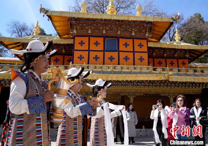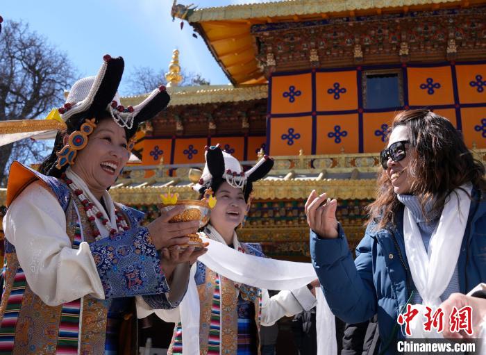 2月20日,由西藏自治區(qū)文化和旅游廳舉辦的2025年香港至拉薩航班首航旅行團歡迎儀式在羅布林卡舉行。來自香港的游客將前往布達拉宮、大昭寺等地,開啟冬游西藏旅途。2月19日,拉薩至香港的首條地區(qū)航線正式開通。航線的開通,更加便捷了兩地居民的出行,也將進一步促進兩地在旅游、文化、經貿等領域的交流與合作。圖為歡迎儀式現場,工作人員向香港游客敬獻青稞酒。中新社記者 李林 攝