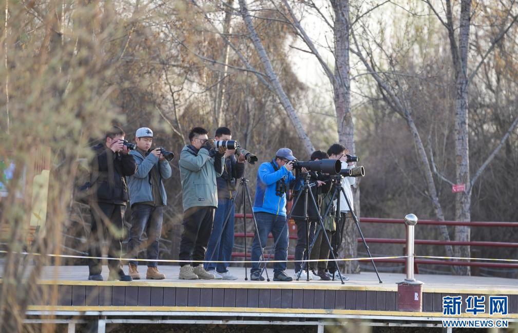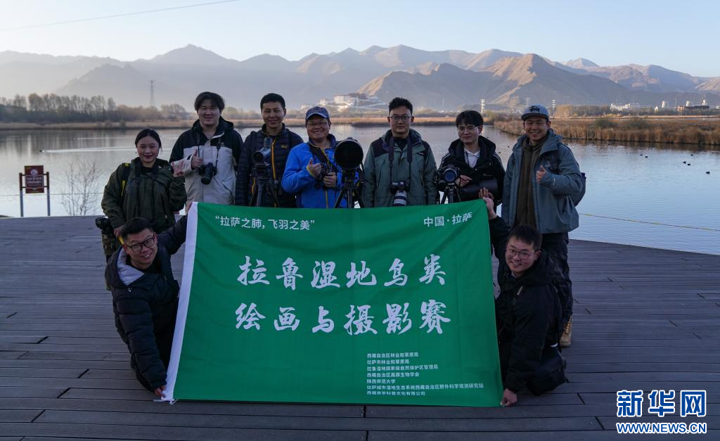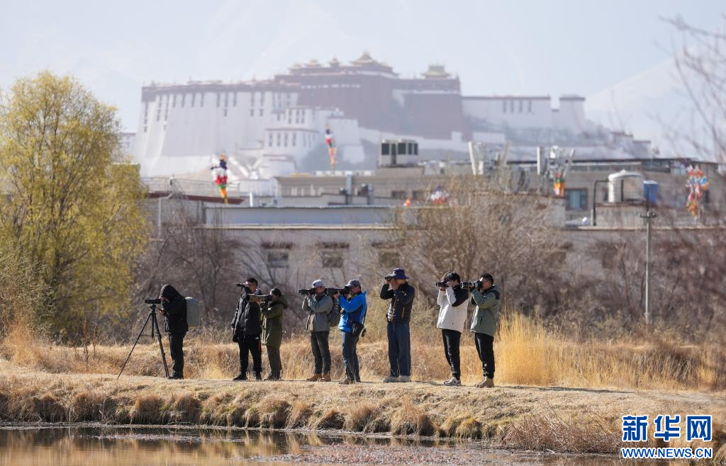 3月29日,參加采風活動的成員在拉魯濕地觀鳥拍照。(新華社記者 晉美多吉 攝)