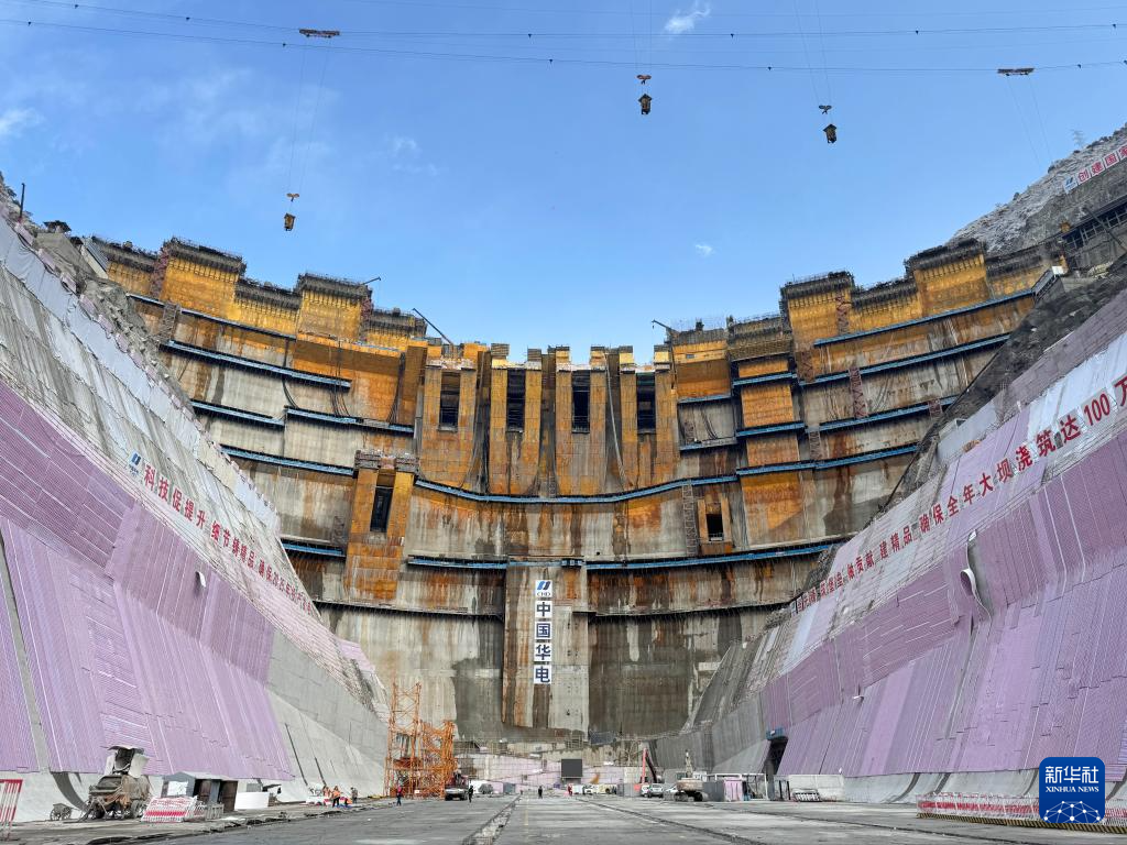 正在建設(shè)中的葉巴灘水電站混凝土雙曲拱壩。(受訪單位供圖)