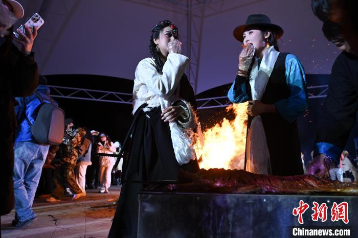 圖為游客身著藏族節(jié)日盛裝在“情定當雄”篝火鍋莊晚會吃烤全羊。中新社記者 貢嘎來松 攝