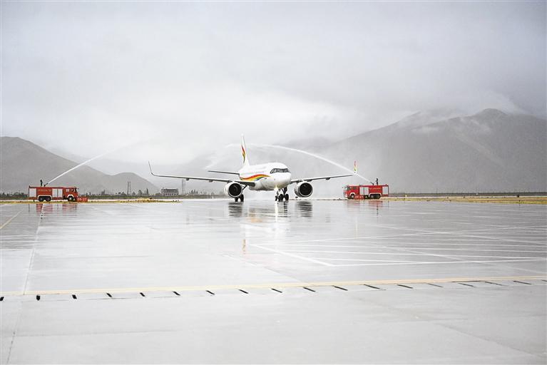 援藏入境旅游包機(jī)在日喀則和平機(jī)場(chǎng)過(guò)“水門”。