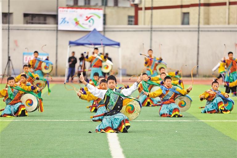 日喀則市學(xué)生為足球友誼賽加油助威。