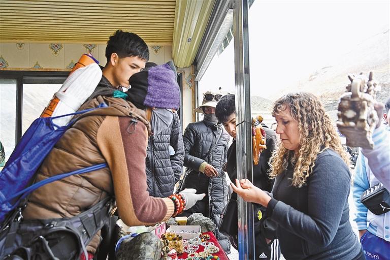 新奇感過(guò)后,游客們開(kāi)啟購(gòu)物模式?!鞍⒓眩@個(gè)掛飾可以定制嗎?”“你們可以發(fā)快遞嗎?”對(duì)于一連串的問(wèn)題,阿佳格桑忙碌地一一回答著,“你們想要什么圖形,我們就給你定制什么圖形?!薄拔覀冞@兒快遞很快,今天下單明天就給你發(fā)!”短短半個(gè)小時(shí),“阿佳格桑工坊”的生意火爆,銷售藏式靠墊、藏式地毯、掛飾等特色產(chǎn)品4000多元?!盎厝ズ?,我要通過(guò)自媒體平臺(tái),宣傳這次西藏之旅的所見(jiàn)所聞,讓更多親朋好友來(lái)西藏旅游!”日本游客琴音有感而發(fā)。