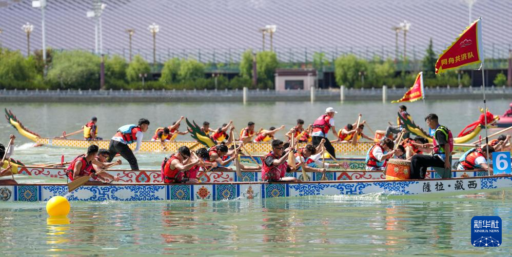 當日,2025年西藏自治區(qū)端午節(jié)牛皮船(龍舟)賽在拉薩濱河公園水域舉行。來自全國各地的160名選手組成的10支龍舟隊伍和20支牛皮船隊伍同在高原競渡,吸引眾多觀眾到場觀看?! ??