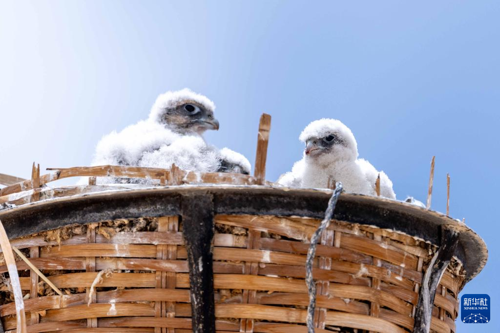 6月7日拍攝的在鷹架上巢中棲息的游隼雛鳥(niǎo)。新華社記者 旦增尼瑪曲珠 攝 ??