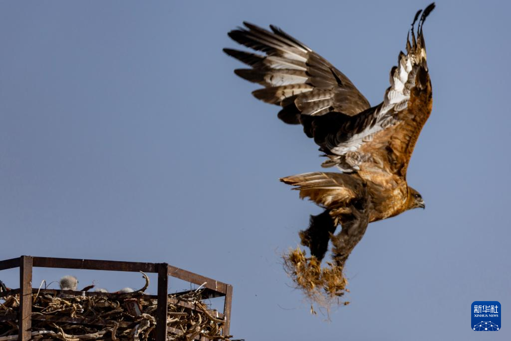 在羌塘草原上,一只游隼飛離鷹架上的巢(6月8日攝)。新華社記者 姜帆 攝 ??