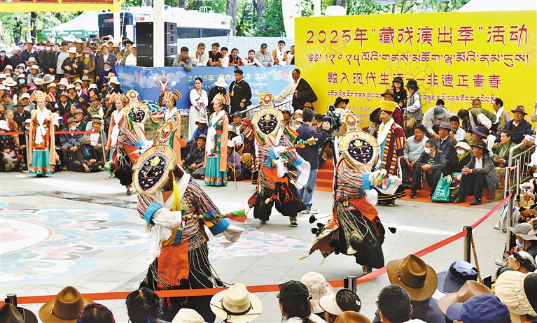 6月13日,以“融入現(xiàn)代生活——非遺正青春”為主題的2025年“藏戲演出季”活動(dòng)在拉薩市宗角祿康公園舉行。本次活動(dòng)由非遺體驗(yàn)、產(chǎn)品展銷(xiāo)、藏戲展演三個(gè)部分組成,精彩的表演吸引了眾多市民游客觀看。圖為活動(dòng)現(xiàn)場(chǎng),拉薩市堆龍德慶區(qū)措麥藏戲隊(duì)帶來(lái)的藏戲劇目《智美更登》。記者 旦增蘭澤 攝