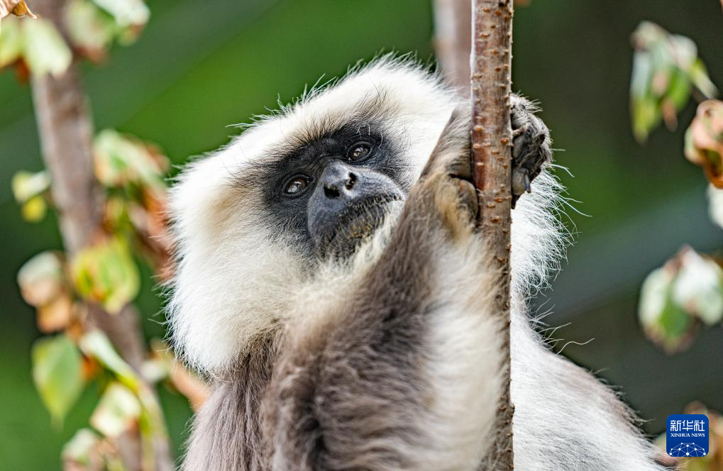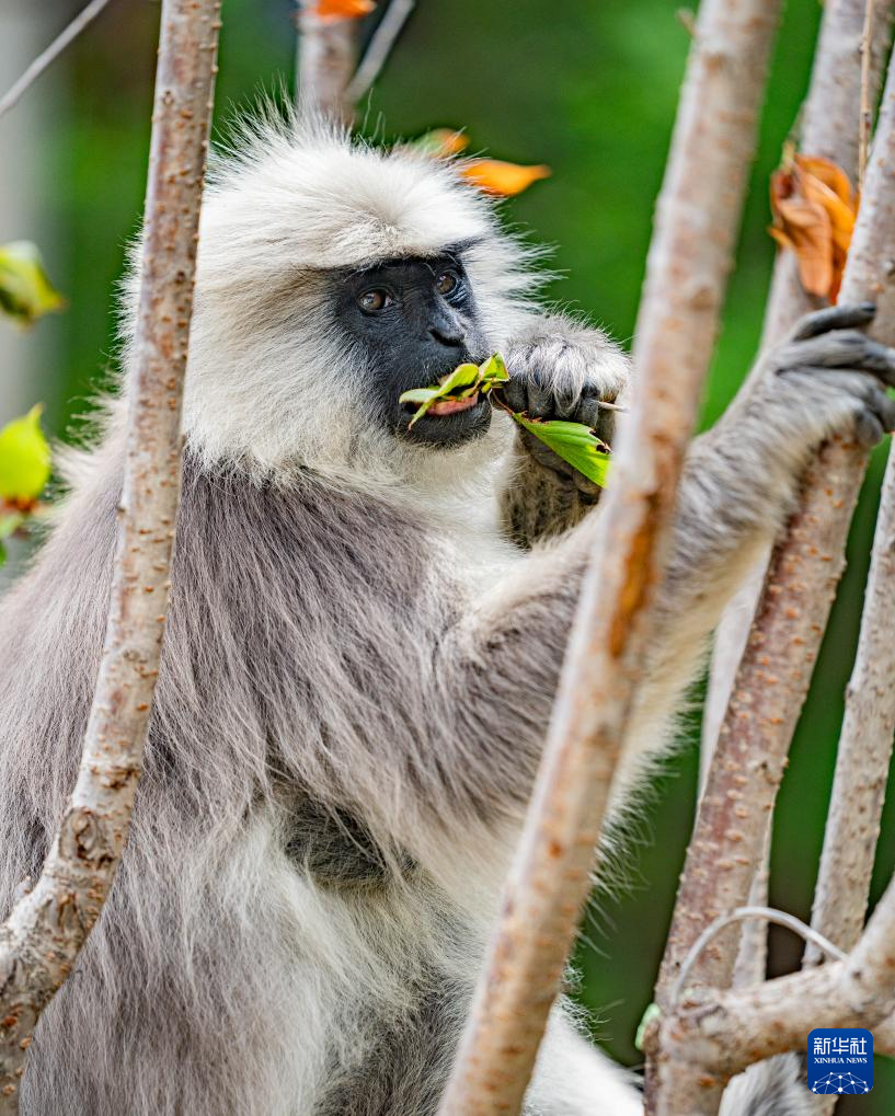 6月20日,在日喀則市亞?wèn)|縣,一只長(zhǎng)尾葉猴在吃樹(shù)葉。新華社記者 丁增尼達(dá) 攝 ??