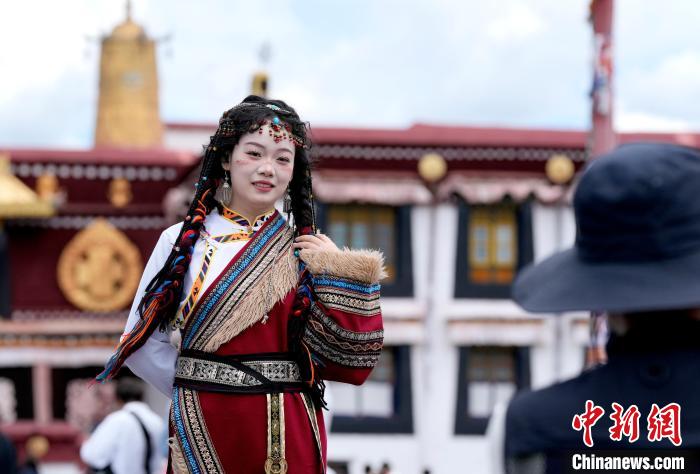 圖為6月24日,游客在大昭寺廣場(chǎng)拍攝藏服寫真。李林 攝