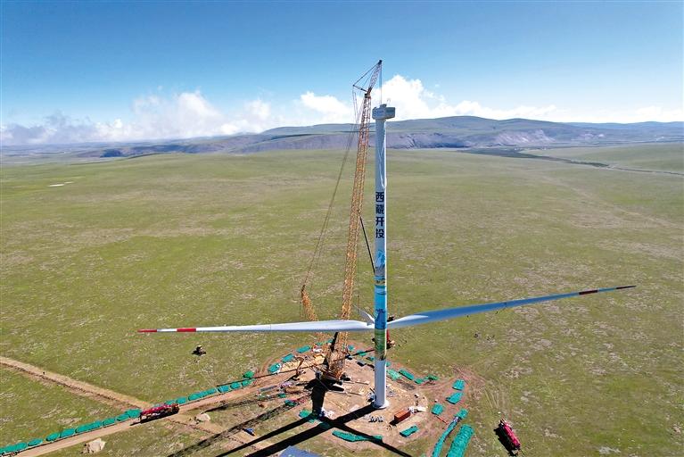 圖為西藏開投色尼區(qū)曲果嘎姆200MW風(fēng)電項目首臺風(fēng)電機(jī)組吊裝現(xiàn)場。周俊 李梅英 攝