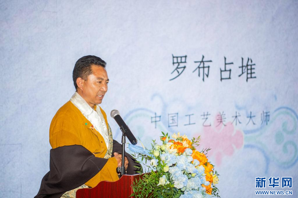 7月7日,中國工藝美術(shù)大師羅布占堆在活動現(xiàn)場交流發(fā)言。新華網(wǎng) 旦增努布 攝