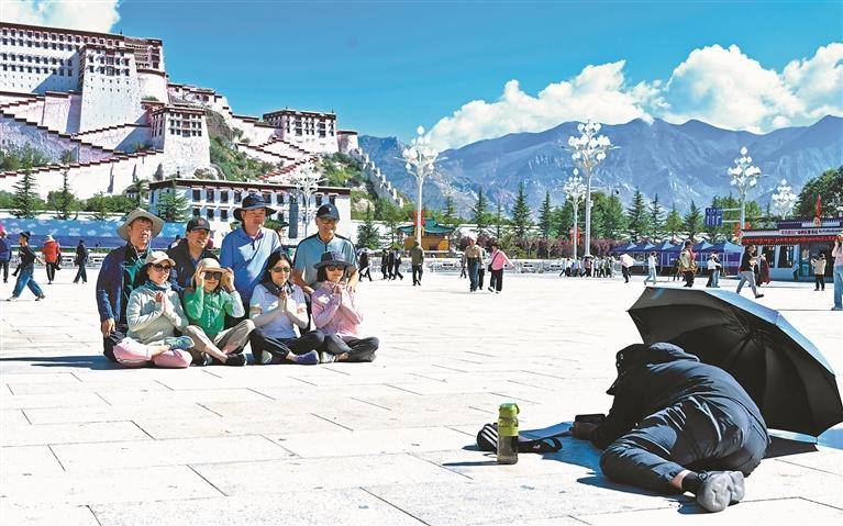 圖為游客在布達拉宮廣場拍照留念。記者 唐斌 攝