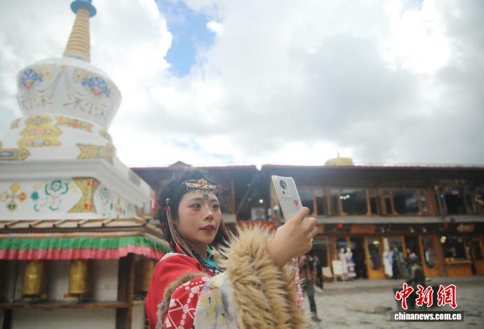 9月27日,一名身穿藏族服裝的游客在香格里拉獨(dú)克宗古城打卡?!↑S興鴻 攝