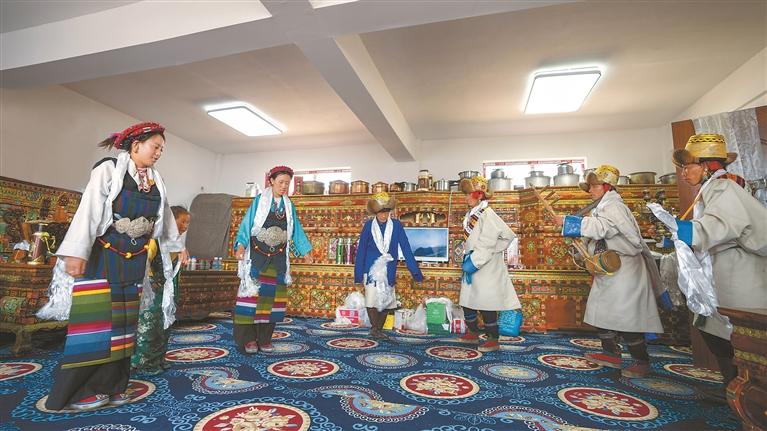 “康索”在加布村黨支部書記多吉的主持下開始,他為索朗頓珠全家一一獻(xiàn)上潔白的哈達(dá),并朗聲念誦吉祥祝詞:“在黨的光輝照耀下,我們這片曾經(jīng)受傷的土地重新煥發(fā)勃勃生機。愿家宅平安,納福迎祥,愿這水缸永遠(yuǎn)滿盈,愿這爐火永遠(yuǎn)旺盛!”