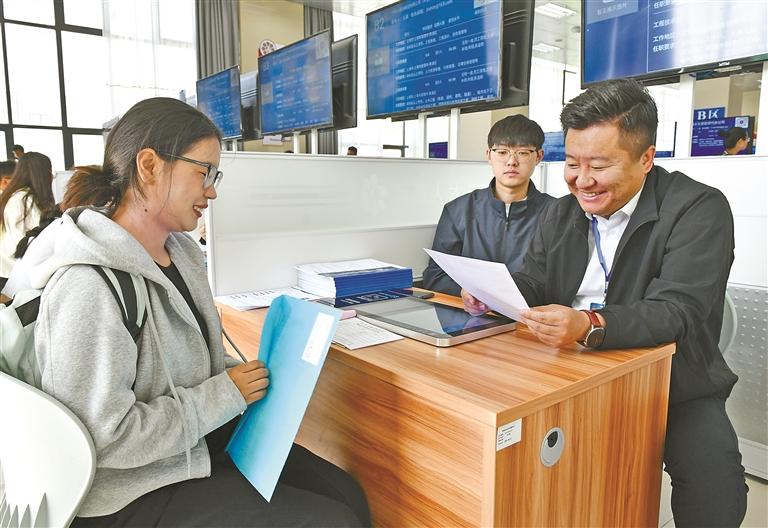 圖為自治區(qū)就業(yè)服務(wù)中心舉辦的2025年全民數(shù)字素養(yǎng)與技能提升專場招聘會上,求職者在面試。記者 旦增蘭澤 攝